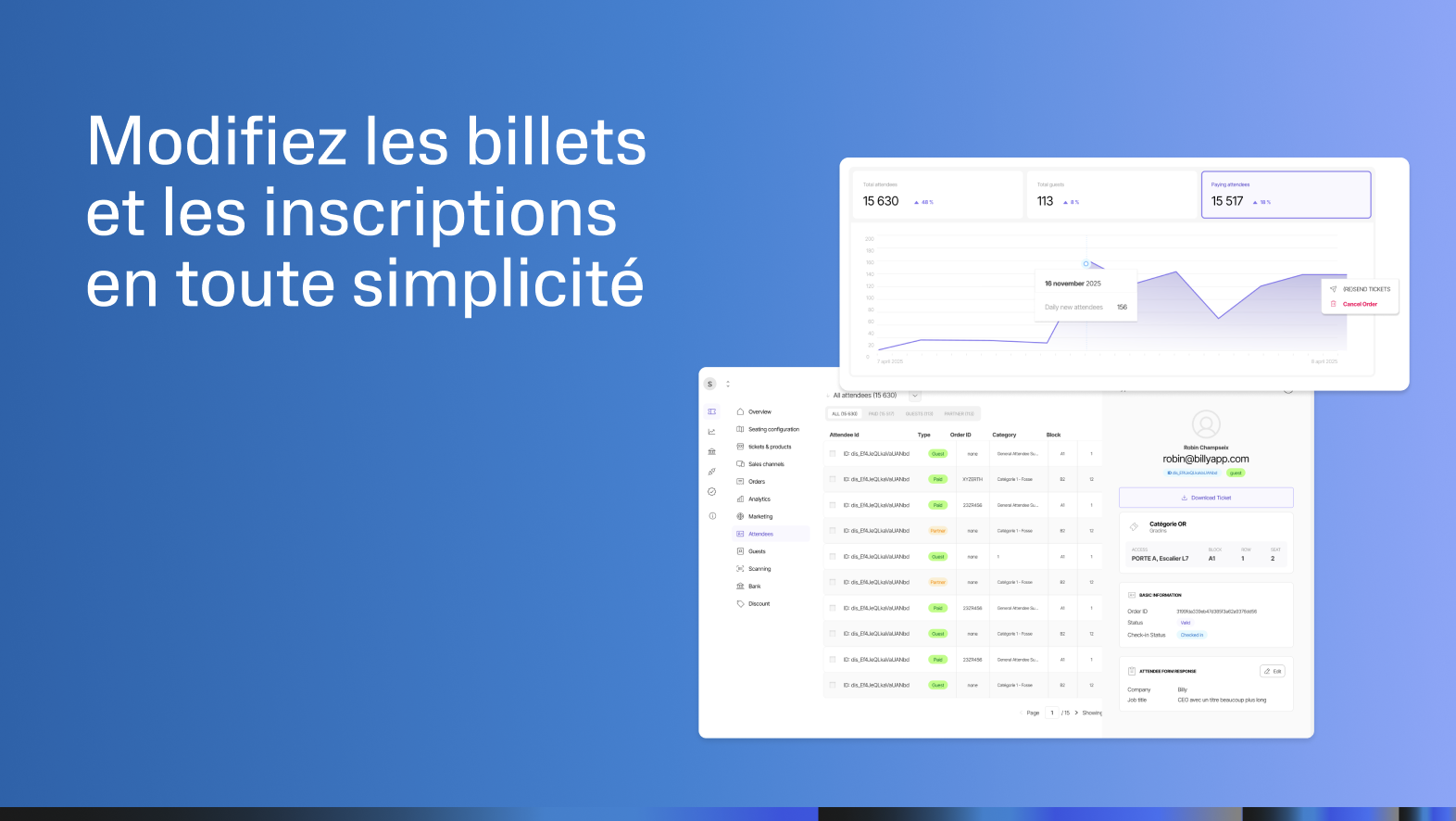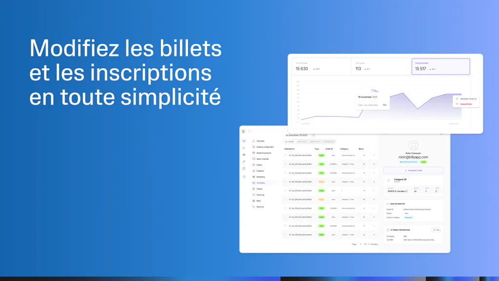 🎉 Le résultat : la Gestion des Participants transforme Billy en une plateforme événementielle vraiment flexible, vous donnant le contrôle pour gérer les participants professionnellement à n'importe quelle échelle—de la correction de simples fautes de frappe à la réassignation de billets pour des centaines d'invités.